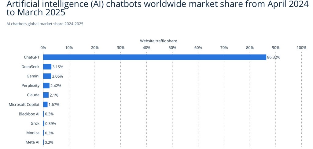 Та при чатботовете абсолютен лидер е ChatGPT. Трафика на Google падна драстично. Макар че се носят слухове, че ChatGTP всъщност “гугълва” вместо нас. От OpenAI не коментират.