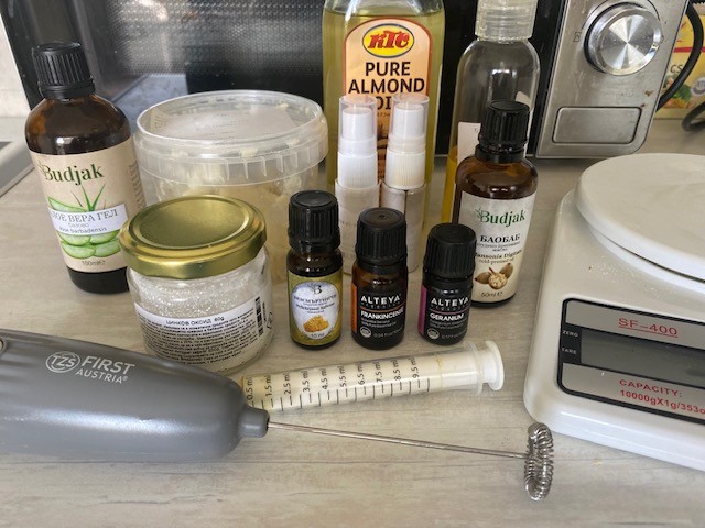 Аз слагам толкова много базови масла, защото имам. Може да сложите само едно. От бадем например! Тогава трябва да е 40 мл. Можете да не слагате маслата от морков и малинови семки, а само цинков оксид.