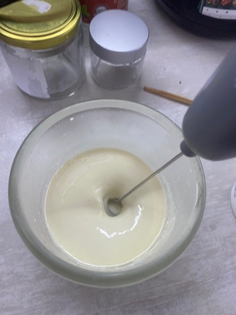 Като се изважда е охладена, гъста и течна смес. Тогава добавям 20 мл. алое вера гел. За хидратация основно. Отново разбърквам с миксчертето за фрапе (хванах го на промоция в Кауфланд за 3 лева, чудна работа върши, взех си 2), разливам в бурканчета и слагам в хладилника. Утре ще ползвам.