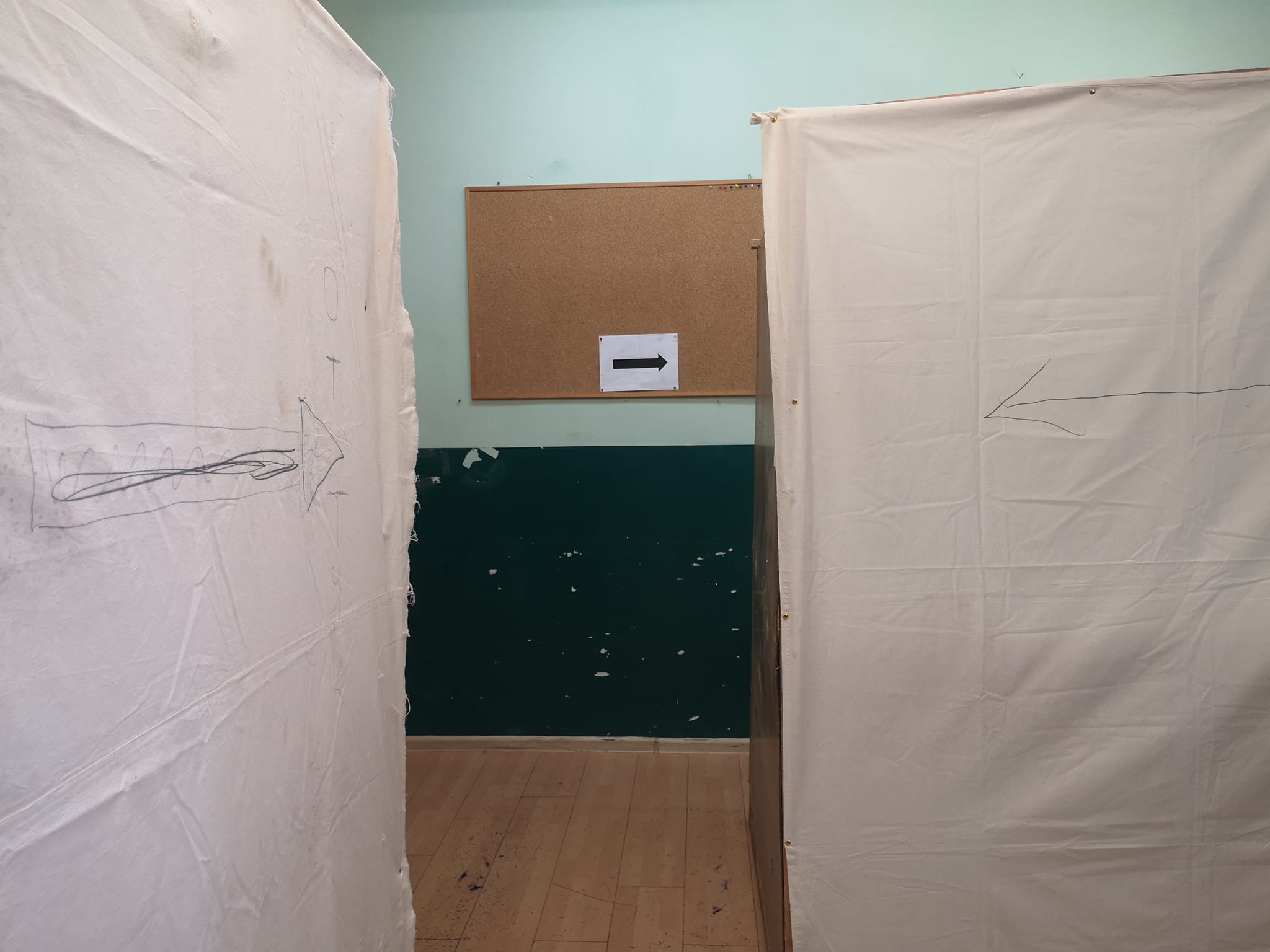 16.30 бяхме пред Община Ихтиман, взехме си материалите и потеглихме към секциите. Първият шок за мен беше като влезнах в секция 30 – класна стая на първолаци, 5 на 5 метра. В нея сковани два „паравана“. Наистина сковани – за пода, на класната стая! С шперплат на срещуположните страни и плътен бял брезент от третата. Четвъртата страна – вход. Перфектно за сценарий #2. Гласуваш и снимаш, за да докажеш.